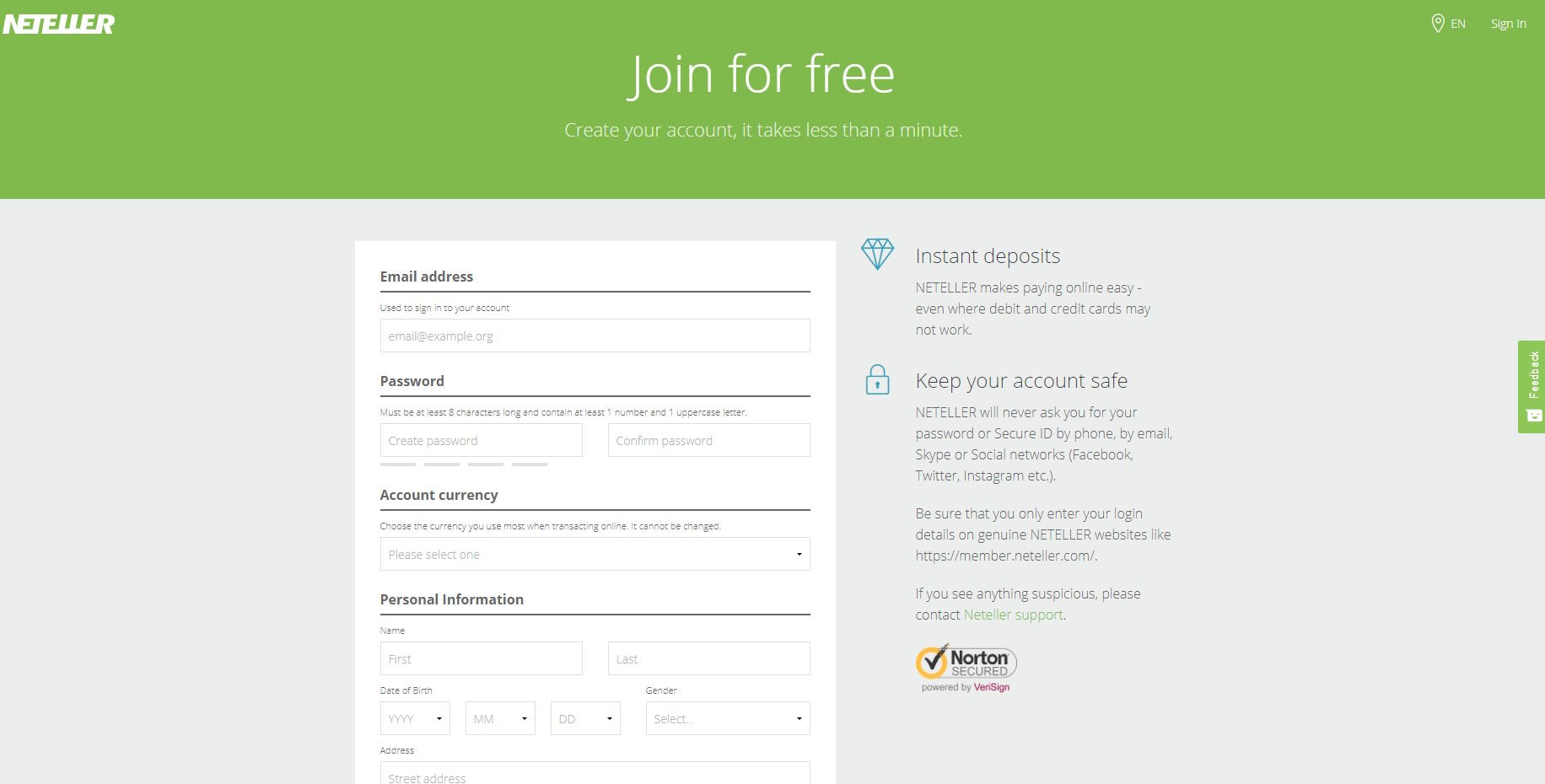 Registrace u Netelleru je jednoduchá, stačí pouze vyplnit online formulář, kam zadáte své osobní údaje. Následně Vám bude vytvořen účet, který bude mít status „neověřený“. V tuto chvíli budete mít omezené možnosti manipulace s účtem, takže bude potřeba provést ještě verifikaci. Tu provedete vkladem financí na účet a dodržením pár dalších kroků, na které budete tázáni. Jakmile toto dokončíte, můžete si začít užívat všech výhod, které Vám Neteller nabízí.
