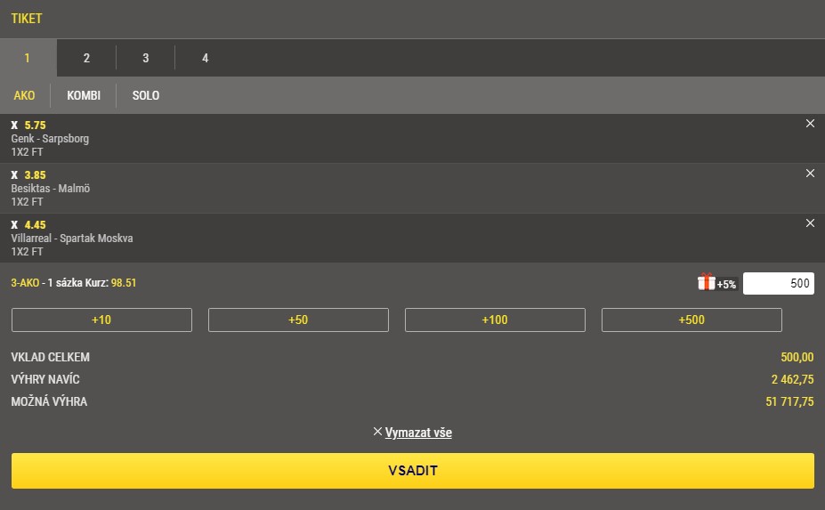 Vsadit si není žádná věda, stačí, když si vyberete sport a zápas, a následně kliknete na sázkovou příležitost, která se ihned přidá na Váš tiket na pravé straně obrazovky. Takto můžete přidávat ještě další příležitosti a poté už jen zadáte částku vkladu a odešlete tiket tlačítkem „Vsadit“. Průběh Vaši sázky můžete sledovat pomocí tlačítka „Otevřené sázky“ na horní liště webových stránek. A pozor, můžete mít rozdělané až čtyři tikety najednou!